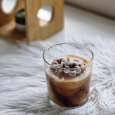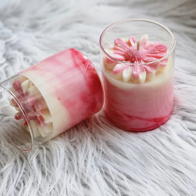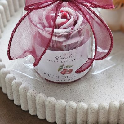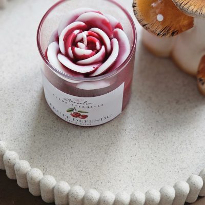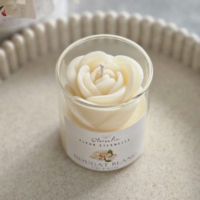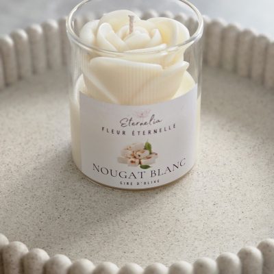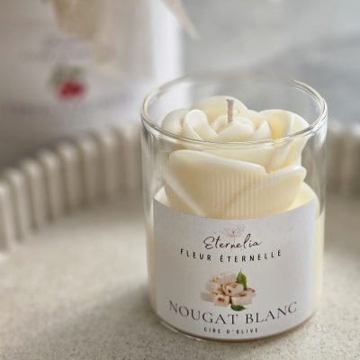 - 🌸 Bougie artisanale coulée à la main, décorée d’une rose en cire. 150 g de cire d’olive pour environ 30 h de combustion. Un modèle unique, élégant et naturel.