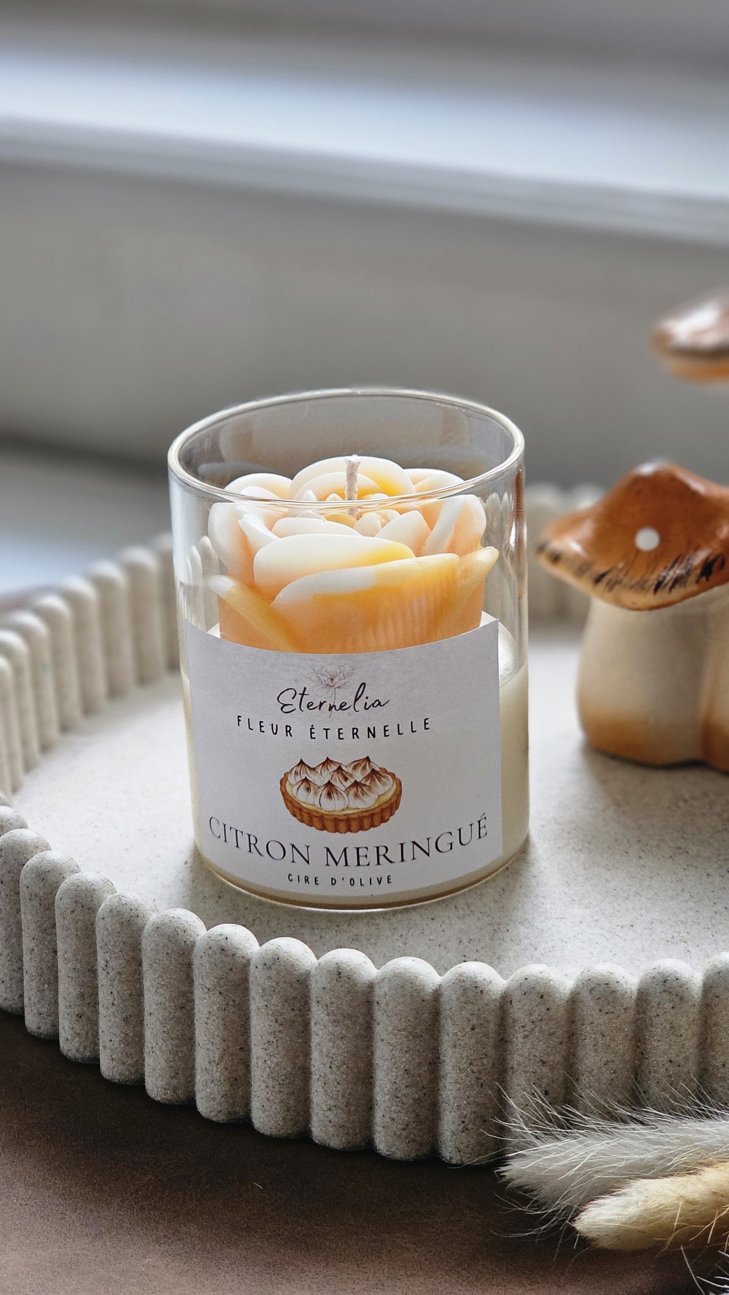 🌸 Bougie artisanale coulée à la main, décorée d’une rose en cire. 150 g de cire d’olive pour environ 30 h de combustion. Un modèle unique, élégant et naturel.