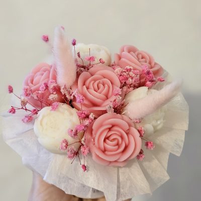 Un coffret artisanal généreux, rassemblant 10 roses (bougies) et 10 pivoines (fondants parfumés), pour un total d’environ 500 g.