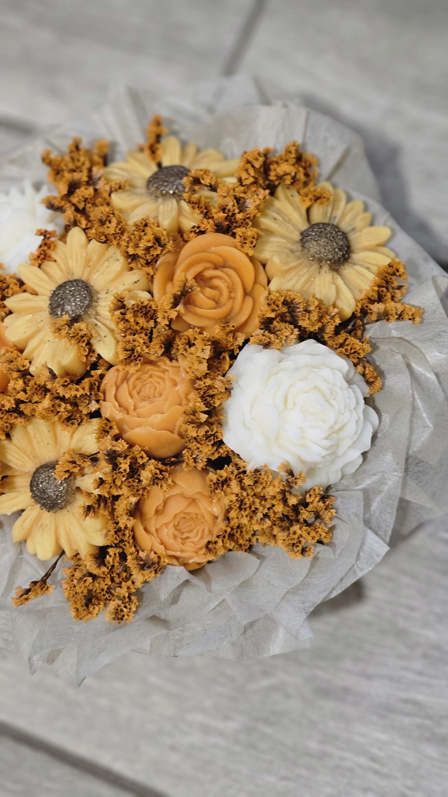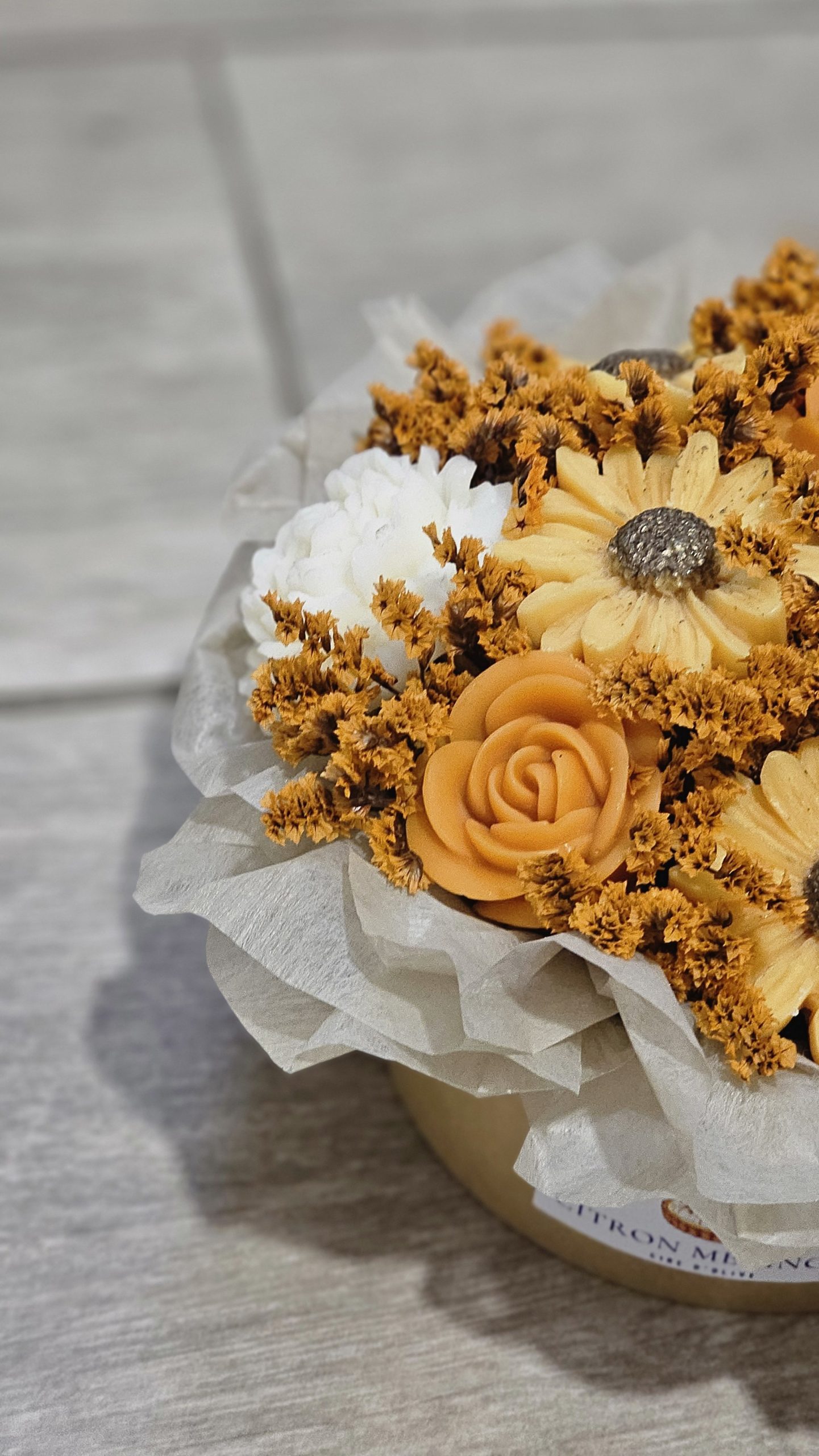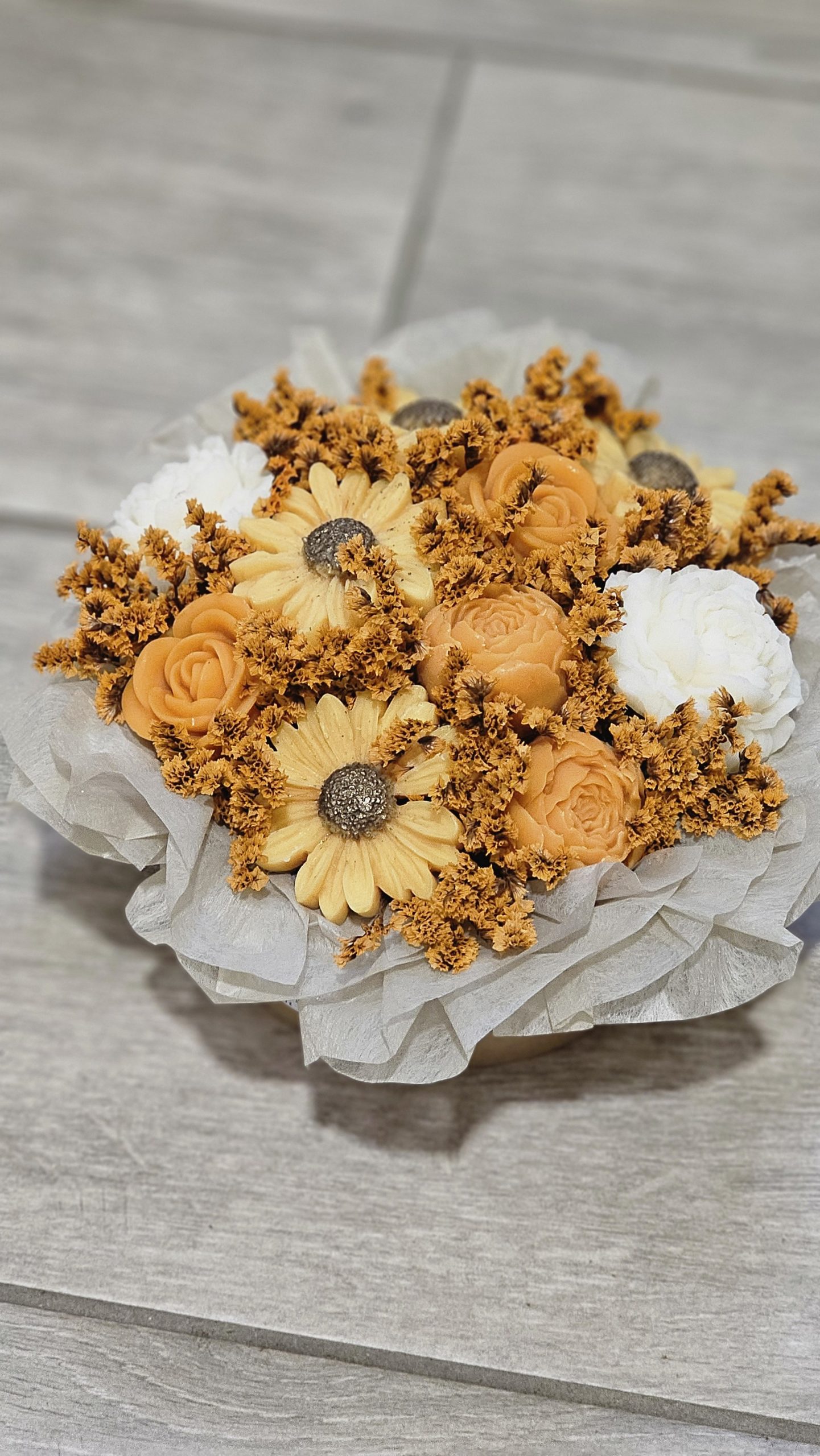 Découvrez un petit bouquet artisanal présenté dans une boîte ronde kraft, avec ses fondants parfumés pour un rendu élégant et poétique.