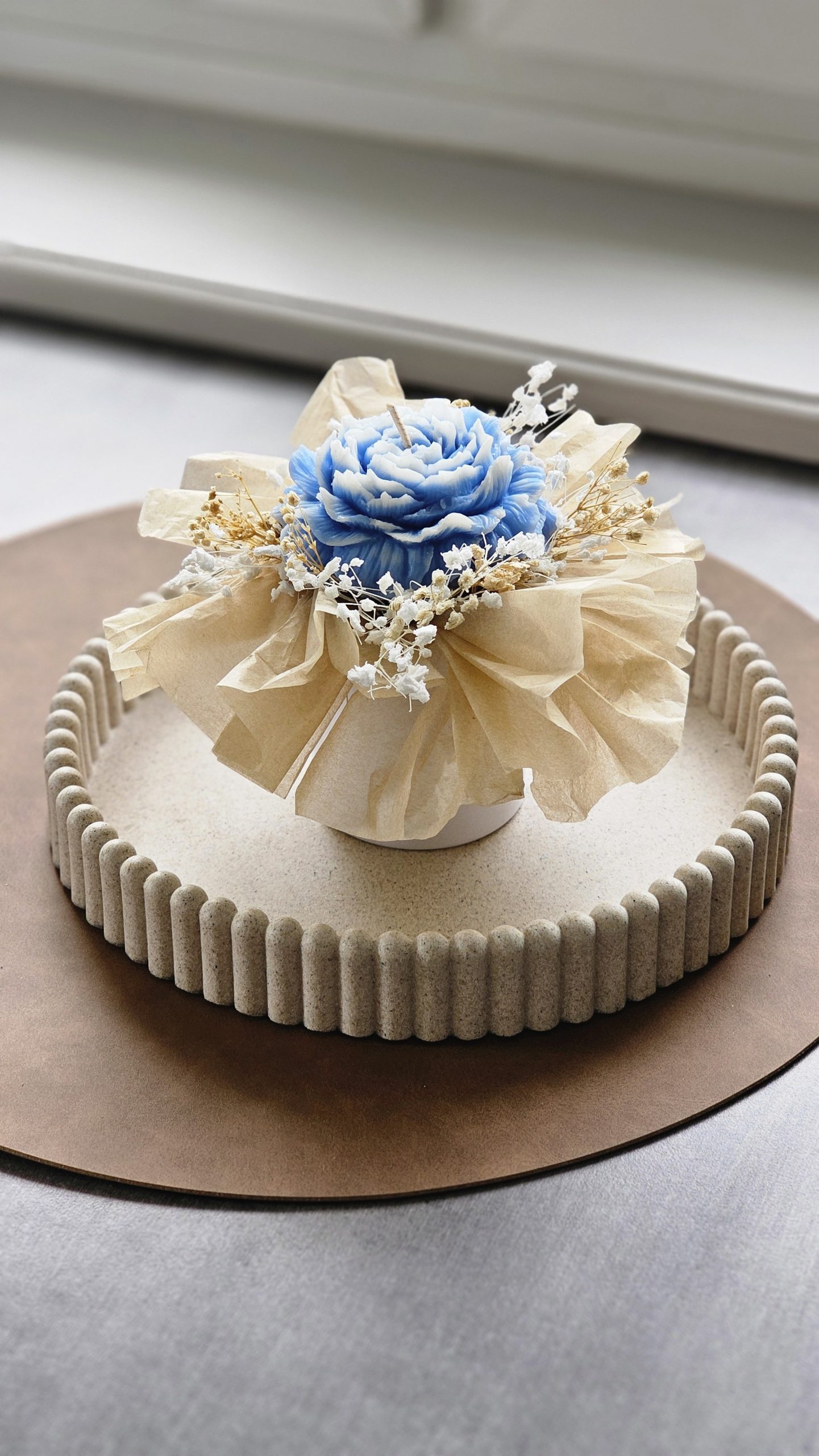 Découvrez une boîte artisanale et minimaliste (6 x 6 cm) renfermant une fleur de pivoine en cire d’olive 100 % végétale, accompagnée de délicates fleurs séchées pour une touche élégante et poétique.