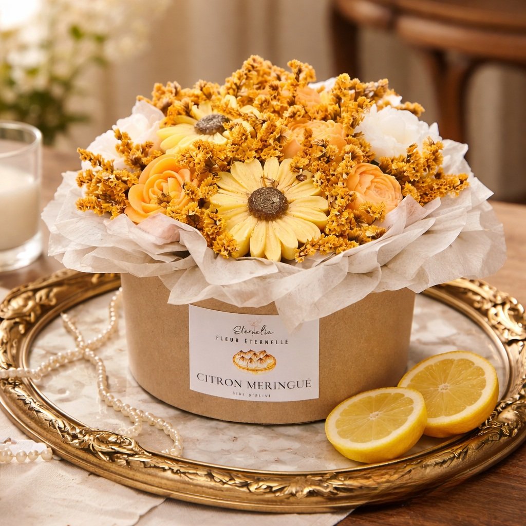 Un bouquet artisanal dans une boîte ronde avec des pivoines et roses parfumés 🌸. Rendez votre intérieur chaleureux grâce au parfum Nougat Blanc 🍬
