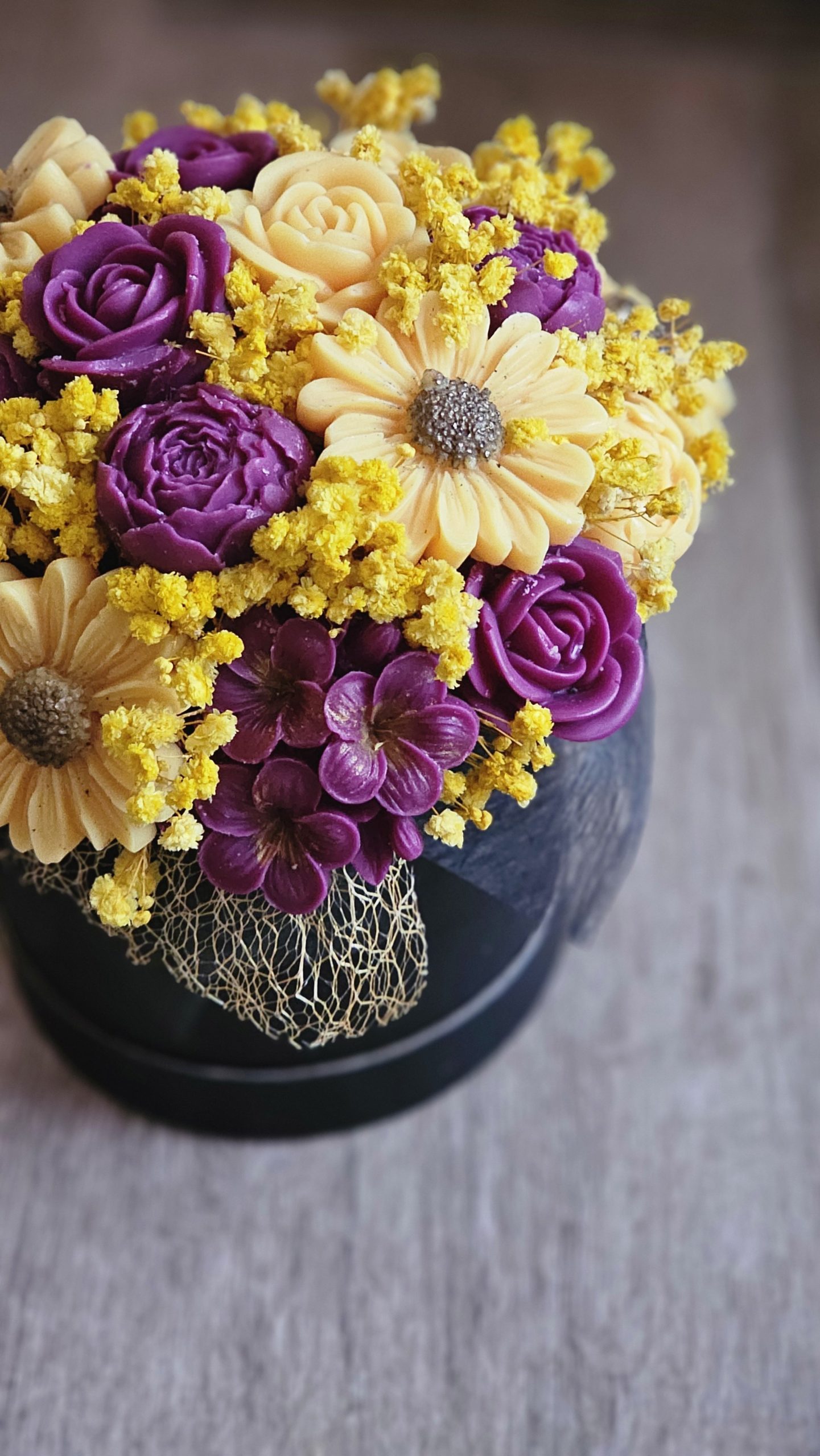 Le bouquet est conçu avec des fleurs en cire aux tons or miel et prune, disposées pour servir à la fois d’objet décoratif et de source parfumée. Chaque fleur peut être prélevée et utilisée comme fondant parfumé dans votre brûle-parfum. 🌸