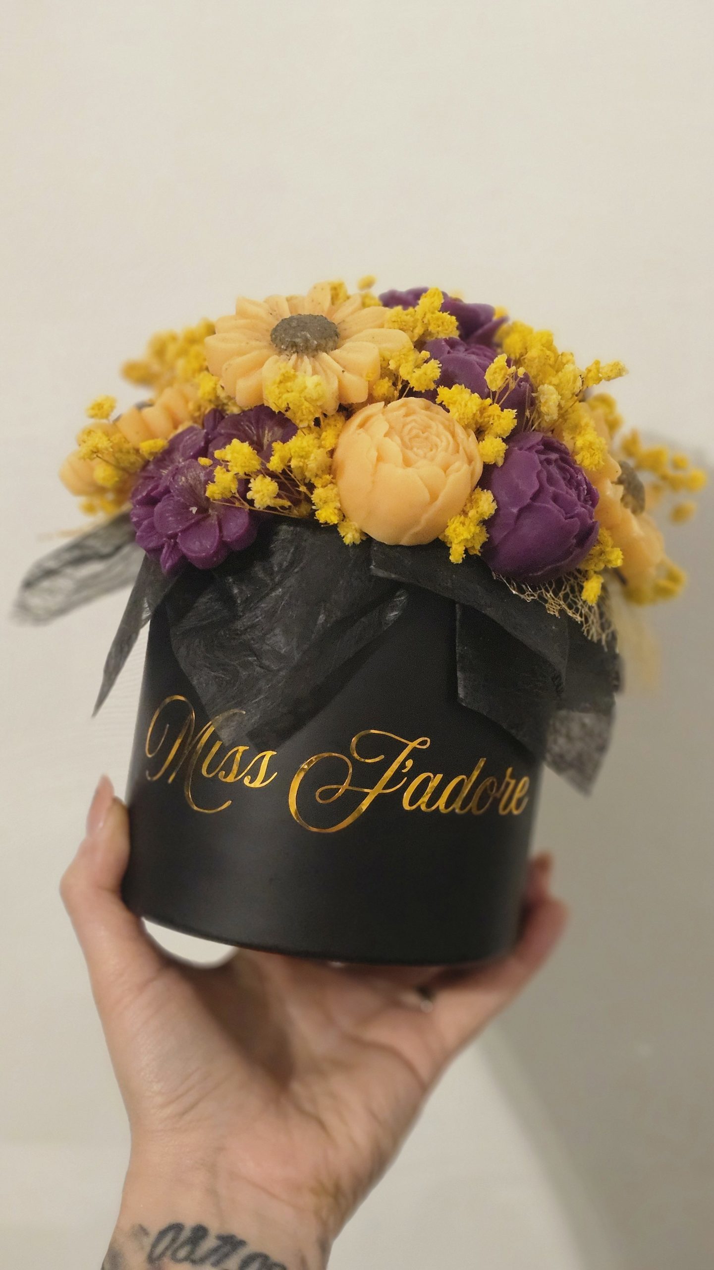 Découvrez le bouquet Miss J’adore, inspiré d’un parfum féminin très reconnu. Composé d’environ 360 g de cire parfumée et agrémenté de 20 g de fleurs séchées, il dévoile des teintes prune et jaune pour un rendu élégant et lumineux. 🌼