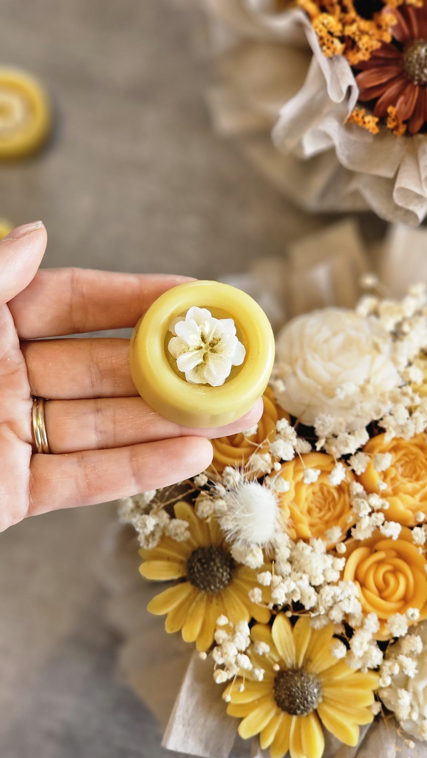 - Une fleur en cire d’olive centrale, ajoutant charme et authenticité.